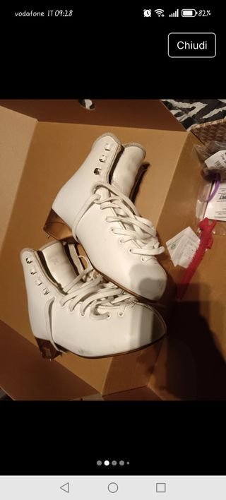 Pattini artistici da ghiaccio Risport Etoile. Scarpa in pelle naturale impermeabile con interno in microfibra di fascia media/alta. Indice di rigidità: 30. Taglia 37 eur. 245. Bianchi del marchio Risport, modello Etoile. Perfetti per iniziare con il pattinaggio artistico. Solo la scarpa costa 180 senza lame né protezioni, risparmiando circa 120 euro. - Chiusura con lacci. - Lame da pattinaggio artistico. - con pochissimo utilizzo, quasi minimo.