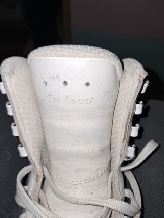 Pattini da scuola del marchio Carlos Mur. Colore bianco. Chiusura con lacci, da sostituire. Struttura Risport. Pletina Atlas numero 14. Pattini usati ma curati per mantenere la pelle idratata ed elastica. Mancano le solette per gli scarponi.
