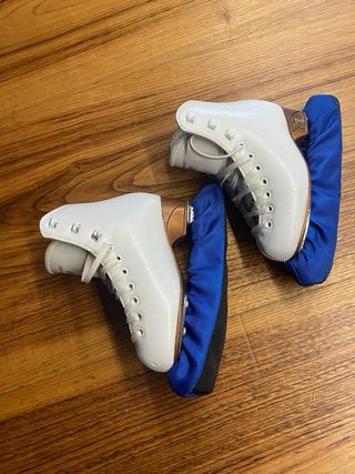 Pattini da ghiaccio Risport Antares in bianco. Design classico ed elegante. Chiusura con lacci. Dettaglio del logo sul tallone. Sono un po' graffiati e segnati perché usati. A parte questo, sono in buone condizioni. Li vendo con protezioni rigide e morbide per l'uso fuori dal ghiaccio. Taglia 34 di scarpe normali o 225 in taglia pattini.