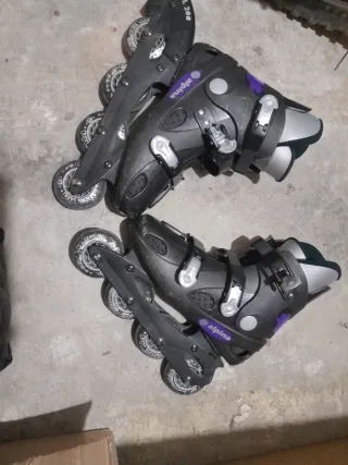 Pattini in linea marca Alpina, ideali per divertirsi all'aria aperta. - Chiusura con lacci e fibbie. - Ruote resistenti per un'ottima scorrevolezza. - Design nero con dettagli viola.