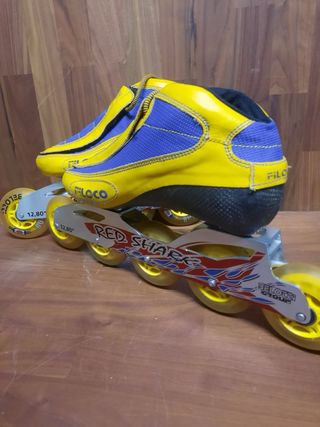 - Pattini in linea da velocità a 5 ruote - Marca: Belotti Filoco - Fibre di carbonio - Misura: 38 (24cm) - Leggera raschiatura trascurabile come da foto - Usati pochissimo