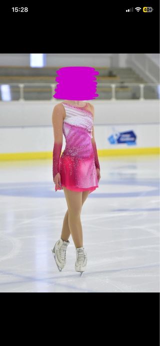 Bellissimo vestito sartoriale per pattinaggio artistico, ideale per gare. Colore rosa sfumato con dettagli scintillanti. - Design asimmetrico con una spalla. - Maniche lunghe. - Tessuto elasticizzato per massima libertà di movimento. È in buone condizioni in generale ma perde qualche brillantino.