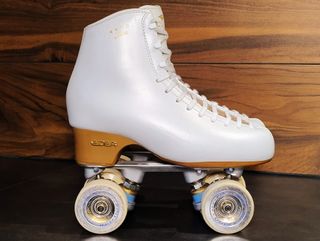 Pattini professionali con stivaletti bianchi EDEA Chorus taglia 255 che secondo tabella Edea corrisponde al n. 38 EU. Set di ruote Roll-line Giotto diametro 63. In ottime condizioni come da foto e pronti per pattinare. Telai Roller Paioli Senior Figure. Da obbligatori. Gli stivaletti hanno solo qualche piccolissimo segno visibile in foto e sono puliti sia dentro che fuori. Così completi da nuovi costano circa 500 euro! Made in Italy.