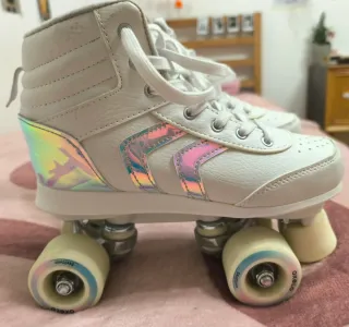 Pattini a 4 ruote marca Oxelo, misura 37. - Design alto e bianco. - Dettagli iridescenti sulle fasce laterali e sul tallone. - Ruote colorate con scritte. - Chiusura con lacci bianchi.