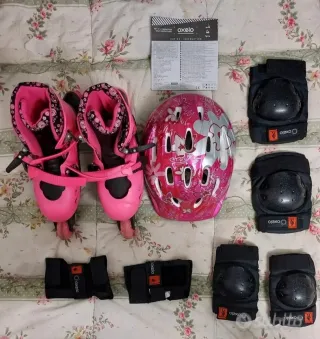 Set completo per pattinare, ideale per iniziare. Include pattini, casco e protezioni. - Pattini a rotelle rosa con chiusure regolabili. - Casco protettivo rosa con design floreale. - Set di protezioni per ginocchia, gomiti e polsi. - Marca: Oxelo.