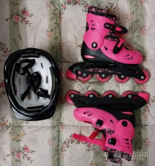 Vendo un paio di pattini a rotelle nuovi, perfetti per iniziare a pattinare. Sono neri con dettagli rosa, e sembrano in ottime condizioni. - Pattini a rotelle taglia regolabile - Colore nero e rosa - Perfetti per bambini