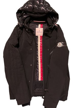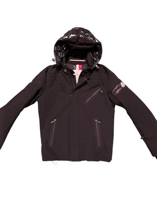Giacca da sci Moncler da uomo, perfetta per le piste. - Cappuccio imbottito lucido. - Dettagli a righe tricolore. - Logo Moncler sulla manica.