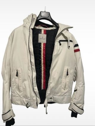 Giacca da sci Moncler in colore beige, perfetta per le giornate sulla neve. - Cappuccio integrato. - Tasca frontale con zip. - Dettagli a righe su una manica. - Polsini neri.