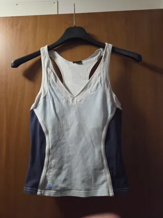 Canotta running da donna Nike, in discrete condizioni. Taglia S all'interno ha il reggiseno. Usata - Design a vogatore - Inserti laterali a contrasto - Logo Nike - Scritta TRAINING sul lato