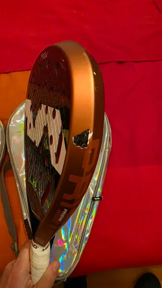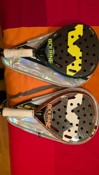Set di due racchette da padel Varlion Bourne. Una è la Yanguas Mike, versione Summer: i distacchi di vernice in foto sul bordo sono dovuti alla rimozione del protettore L'altra è la versione Winter. Entrambe hanno fatto le loro partite ma ancora pienamente giocabili - Incluse custodie protettive. 30 € l'una o 50 € se prese entrambe