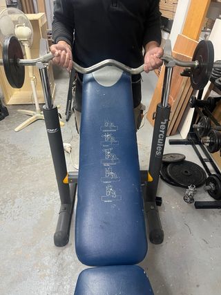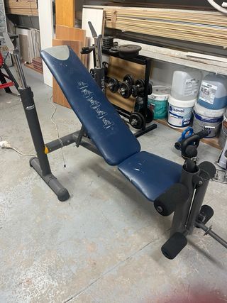 Attrezzatura da palestra per allenarsi a casa. - Struttura per squat, trazioni e panca... - Barra inclusa. - Panca regolabile - Pesi: 2 da 20 kg, 2 da 10 kg, 4 da 5 kg, 2 da 2 kg, 4 da 1 kg.