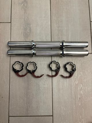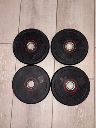 Kit di pesi per l'allenamento a casa. Ho allenato per 1 anno a casa con esso e sono molto soddisfatta, lo vendo perché mi sono iscritta in palestra. Include: - Due barre di manubri con impugnatura antiscivolo. - Un pezzo per unire i due manubri e creare una barra. - Quattro dischi da 2,5 kg. - Quattro dischi da 2 kg. - Quattro dischi da 1,5 kg. - Quattro dischi da 1,25 kg. - Sei chiusure a vite per fissare i dischi. - Un paio di guanti da palestra e un paio di fasce da polso. Per qualsiasi domanda non esitate a scrivermi! Accetto offerte