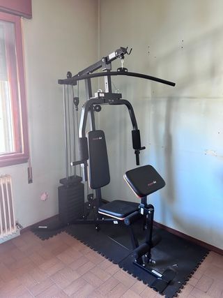 Macchina da palestra per allenarsi a casa. Struttura robusta e design compatto. - Panca regolabile. - Barra per cavi alta e bassa. - Supporto per pesi.