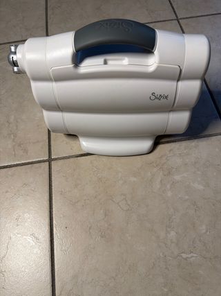 Macchina per il taglio e la goffratura Sizzix Compatta. - Colore bianco. - Manico grigio per il trasporto. - Logo Sizzix visibile.