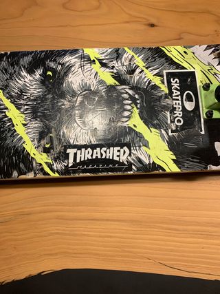 Skateboard con grafica Thrasher Magazine. - Grafica di lupo con dettagli gialli. - Adesivo SKATEPRO presente.