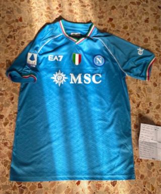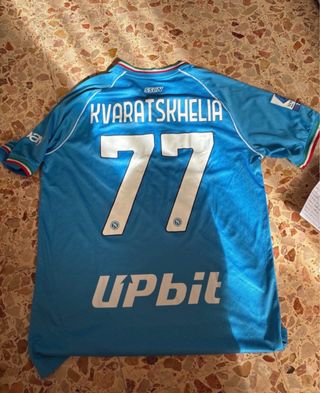 Maglia da gioco del Napoli, numero 77, Kvaratskhelia. - Colore azzurro. - Sponsor UPbit. - Logo SSCN sul retro. taglia M