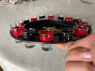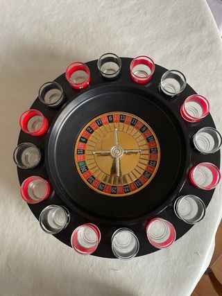 Divertente gioco a tema roulette per bere. - Include la ruota della roulette. - Comprende 16 bicchierini in vetro da shot, alcuni con bordo rosso e altri bordo nero . Diametro cm 30. ottimo ( il gioco è integro ma mancante della sua scatola dove riporlo ) .