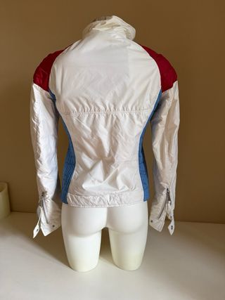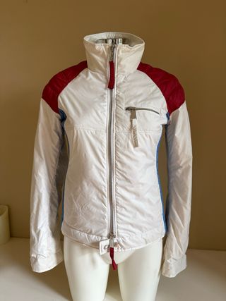 Giacca a vento dal design sportivo e moderno, perfetta per le giornate più fresche. - Colore bianco predominante. - Inserti color rosso sulle spalle. - Dettagli color azzurro sui fianchi. - Zip centrale. - Tasca con zip sul petto. Ottima marca, in vera piuma.