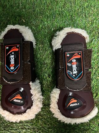 Stinchiere per equitazione Equick taglia S. - Colore marrone. - Fodera interna in pelo sintetico. - Chiusura con velcro. - Logo EQuick stampato.