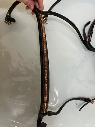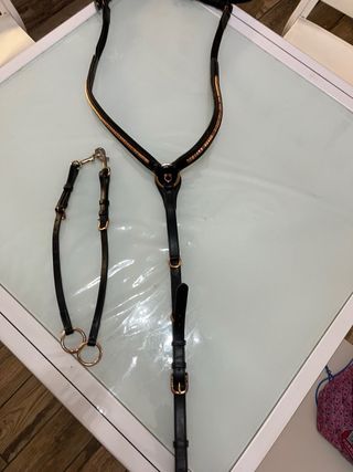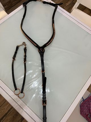 Pettorale e forchette per equitazione in cuoio nero con finiture color rame. - Pettorale con decorazione a strass. - Forchette con anelli. - Presenta segni di usura -prezzo originale:150€ -prezzo trattabile