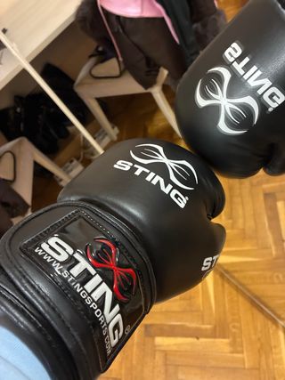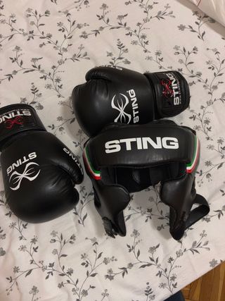 Set di guantoni e caschetto da boxe neri marca STING. - Guantoni in pelle sintetica. -Caschetto con inserti tricolore (verde, bianco, rosso). -Chiusure regolabili.