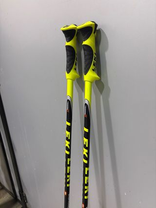Coppia di bastoncini da sci Leki. - Lunghezza: 105 cm. - Colore giallo fluo e arancione. - Impugnatura ergonomica.