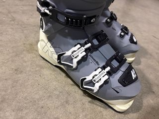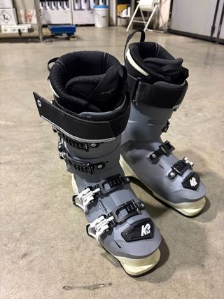 Scarponi da sci K2 per donna, misura 24/24.5. - Lunghezza suola: 284 mm. - Colore grigio con dettagli neri e bianchi. - Chiusura con ganci regolabili. Buonissimo stato