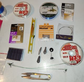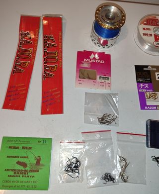 Vendo set di accessori per la pesca, ideale per varie tecniche. - Bobine di filo da pesca (100 M HIKARU, 500 m crivit). - Amo da pesca DUEL Chinu (taglia 2). - Confezione di 10 ami Mustad Anzuelos Montados (taglia 9). - Piombi da pesca di varie forme e pesi. - Galleggiante da pesca. - Scatola porta accessori. - Forbici taglia filo. - Accessori vari (girelle, stopper).