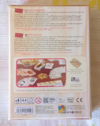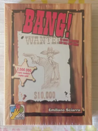 Bang! (è un coinvolgente party game ambientato nel selvaggio West, dove i giocatori si sfidano a suon di pistolettate. Durante la fase iniziale del gioco, ogni partecipante riceve un ruolo: lo Sceriffo, che è palese, e i Furfanti, i Vice Sceriffi e il Rinnegato, che sono segreti. Questa distribuzione crea fazioni, ma nessuno sa realmente chi sia alleato con chi. Il gioco è nuovo di zecca ed è ancora nel cellophane originale. Vendo per doppio regalo - 2.000.000 copie vendute. - Da 4 a 7 giocatori - Editore: dV Giochi.