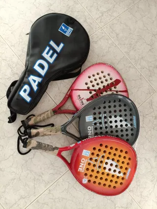 Si vendono 3 racchette da padel con una custodia. - Custodia nera con la parola PADEL in lettere bianche. - Una racchetta rosa con dettagli in bianco e rosso. - Una racchetta grigia con dettagli in bianco. - Una racchetta rossa e arancione con dettagli in bianco.