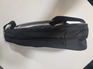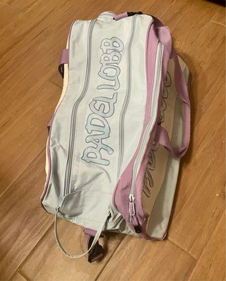 Borsa da padel del marchio Padel Lobb. Colore crema, blu chiaro e viola. Design con logo del marchio ricamato. Maniglie e cinghia per il trasporto. Cerniera principale e tasca esterna. Ampia capacità, tasca per le racchette, scomparto interno per vestiti, trousse... ecc e scomparto interno per scarpe (con accesso laterale). Piccola macchia su una delle maniglie (sembra vernice, non ho provato a rimuoverla)
