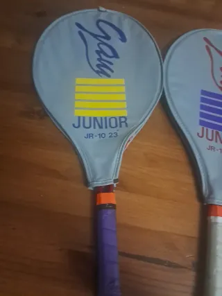 In vendita due racchette da tennis junior del marchio Gram. Modello: JR-10 23. Design con strisce colorate. Impugnatura viola e bianca. Poco usate. Leggere. Sono junior. Spedizione disponibile. Prezzo per unità.