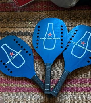 Set di tre racchette da spiaggia con logo San Pellegrino. - Colore blu. - Design con bottiglia e stella San Pellegrino. - Impugnatura nera. un po’ consumato dal tempo