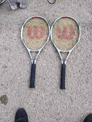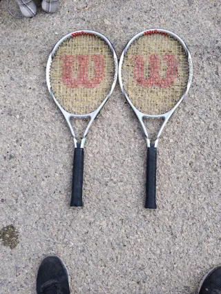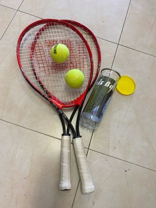 Set di due racchette da tennis Wilson con due palle. - Racchette di colore rosso e nero. - Impugnature con grip bianco. - Include due palle da tennis gialle. - Un contenitore di palle da tennis. Le vendo perché non posso più giocare.