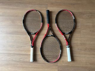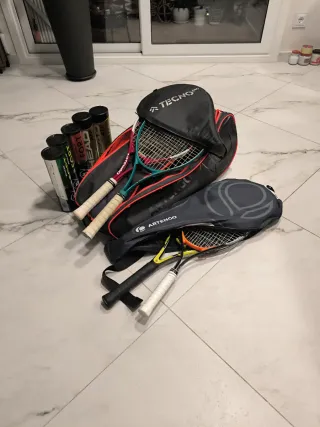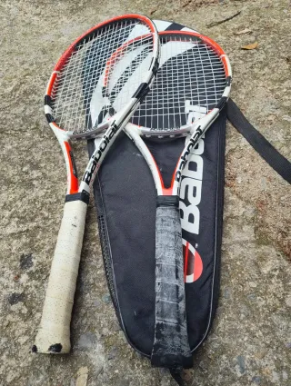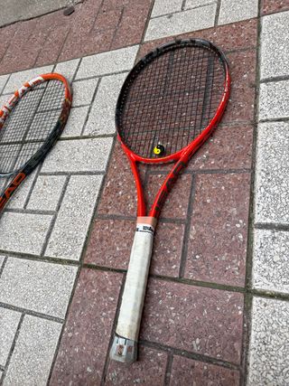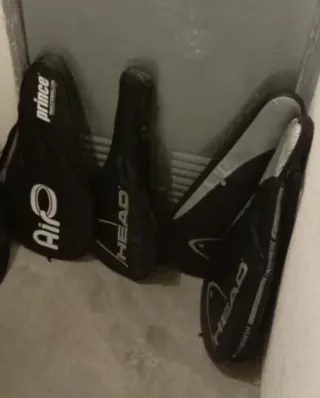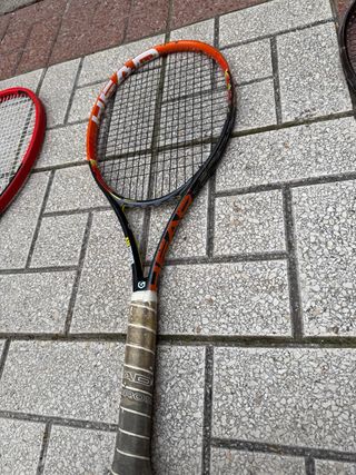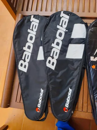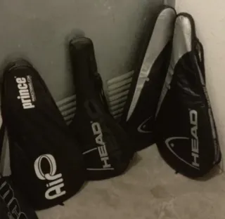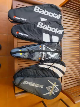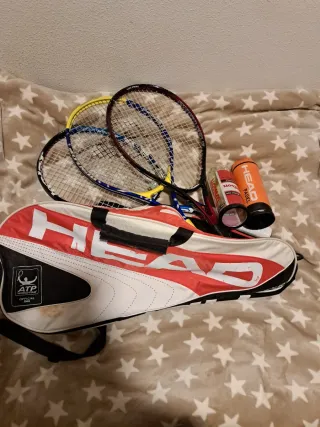 Set di attrezzatura da tennis. - 4 racchette da tennis di diverse marche. - Borsa per teste (ci sta tutto lì) - 3 custodie, una con la chiusura rotta. - 1 tubo di 3 palline usate (in regalo) - 2 grip nuovi da provare (in regalo) - 2 cover nuovi da provare (in regalo)