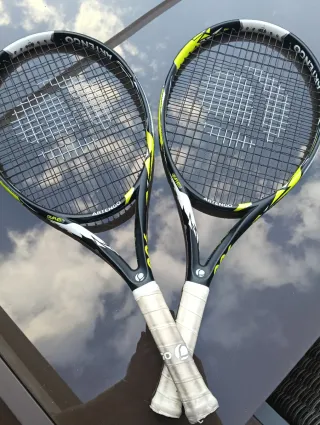 In vendita due racchette da tennis. - Una racchetta è nera con dettagli gialli. - L'altra racchetta è argentata con dettagli neri e gialli. - Entrambe le racchette hanno le corde.