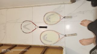 Due racchette da tennis dei marchi HEAD e YONEX. - Racchetta HEAD di colore arancione e nero. - Racchetta YONEX di colore rosso e nero. - Include un amuleto Yin Yang sulla racchetta YONEX.