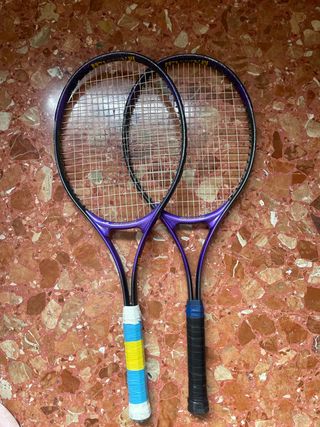 In vendita due racchette da tennis di colore viola. Perfette per giocatori di tutti i livelli. - Telaio viola. - Corde bianche. - Impugnature diverse.