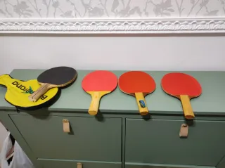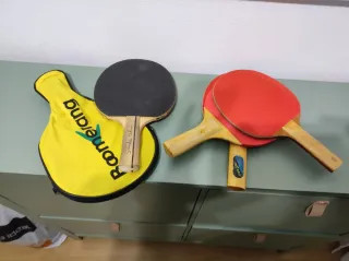 Quattro racchette da tennis da tavolo - Una racchetta nera con fodera gialla. - Tre racchette rosse con manici in legno.
