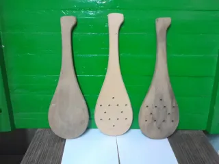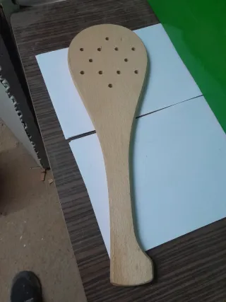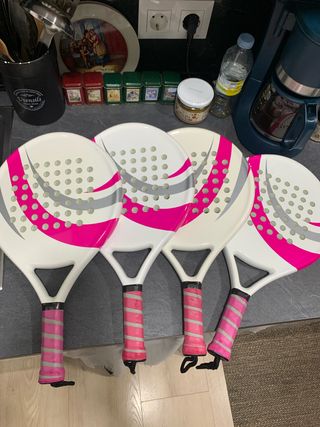 Set di tre racchette da frontón in legno. Ideali per praticare questo sport. Materiale: legno. Design ergonomico per una buona presa. Una racchetta è liscia e le altre due hanno dei fori. Le tre racchette costano 20 euro.