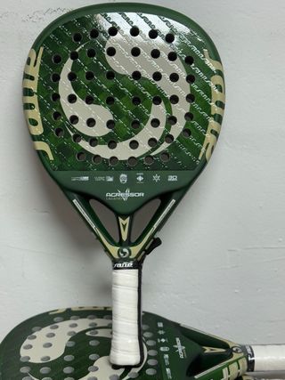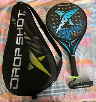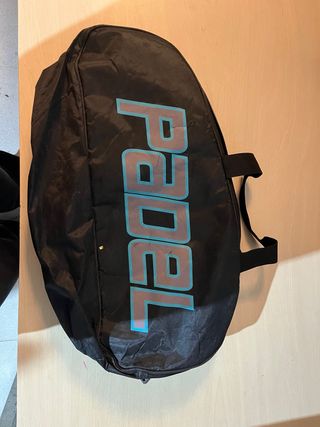 Borsa per racchette da padel del marchio Drop Shot in colore nero con dettagli in blu. Include 2 racchette; una Drop Shot AMB Doppel, con un graffio superficiale sul bordo senza influenze sulle prestazioni e sull'efficienza della racchetta. Include la custodia originale. L'altra è una Bullpadel Vertex 02, leggermente incrinata su una faccia della racchetta, quindi dovrebbe essere riparata per poterla utilizzare. La borsa con le 2 racchette costa 65€. Possibilità di vendita separata.