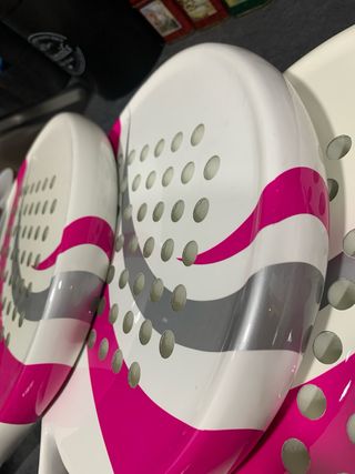 Confezione di due racchette da padel, una della marca Star Vie e l'altra di Sane. - Racchetta Sane modello Woman con finitura in rosa e bianco. - Racchetta Star Vie con design in bianco e nero. Entrambe le racchette hanno uno spessore di 38 mm.