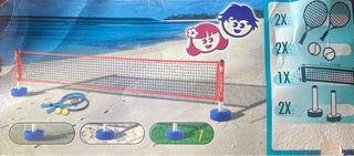 Divertimento gioco di tennis per la spiaggia o il giardino. Ideale per i più piccoli per godersi l'aria aperta. Include 2 racchette, 2 palline, 1 rete di 3,3 metri e 2 pali per la rete.