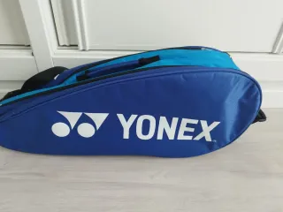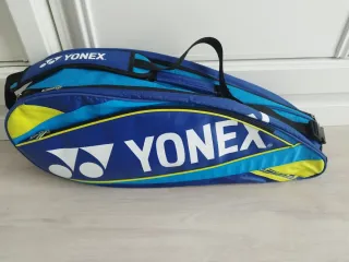 Borsa Yonex con capacità per 6 racchette. Disegnata in blu e giallo, è ideale per trasportare la tua attrezzatura sportiva. Due scomparti per racchette, uno per scarpe e un altro per accessori. In perfette condizioni. Acquistata a gennaio 2026. Prezzo non negoziabile. - Scomparto principale spazioso. - Cerniere resistenti. - Maniglia di trasporto comoda.