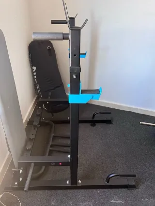 Attrezzatura da palestra completa per l'allenamento a casa. Include rack, panca e accessori. Rack di allenamento. Panca multi posizione. Pesi. 4 dischi da 10kg ciascuno in gomma, tutti del Decathlon. Sistema di pulegge. Accessori per diversi esercizi per petto, schiena, tricipiti e bicipiti. Barra a Z. Usato poche volte e praticamente nuovo. Si consegna imballato e smontato da ritirare.