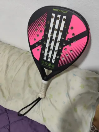 Racchetta da padel con design moderno e accattivante. Colore nero con dettagli in rosa e bianco. Nome MATCH LIGHT nella parte superiore. Include cordino di sicurezza nel manico.