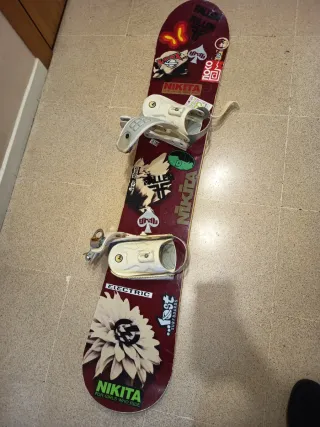 Tavola da snowboard con fissaggi inclusi, taglia 37. Si vende con una custodia Quechua per il trasporto e la protezione.