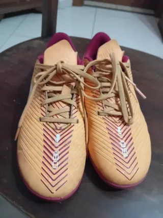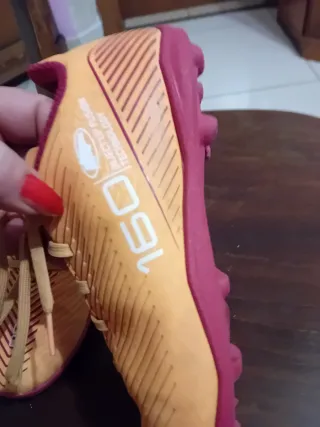 Scarpe da calcio per bambino con un vivace design arancione e dettagli bordeaux. - Tomaia con finiture a righe. - Interno foderato in bordeaux. - Lacci color cuoio.