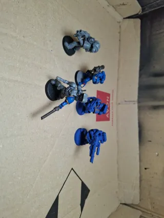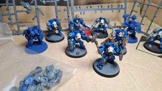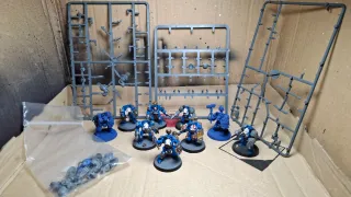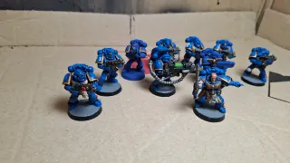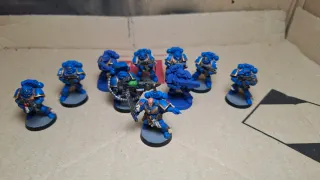 Set di miniature per Warhammer 40k, appartenenti alla fazione degli Space Marine Ultramarines. Le miniature sono dipinte di blu. - Miniature per Warhammer 40k. - Fazione: Space Marine Ultramarines. - Colore: Blu.