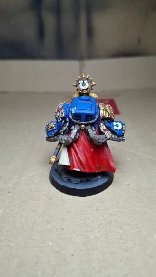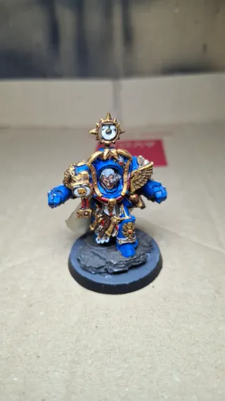 Miniatura di Space Marine Calgar, edizione vintage per Warhammer 40k. In metallo - Dettagli dorati e blu. - Base rocciosa inclusa. - Ideale per collezionisti.